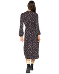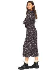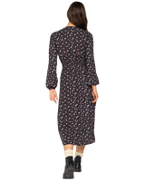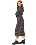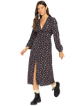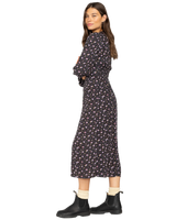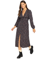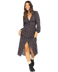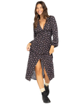 Elevate your evening look with the Billabong Women's Cool Nights Dress in Black Sands. This elegant midi dress features a fitted bodice and an easy-flowing skirt, offering both comfort and style. The deep V-neck adds a touch of allure, while the functional button closure at the front with faux shell buttons enhances its chic appeal. Elastic smocking at the back waist ensures a perfect fit. Crafted from 100% viscose, the dress feels soft and drapes beautifully. Finished with metal plate branding, the Cool Night Dress is perfect for any special occasion, combining sophistication with effortless charm.