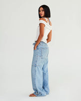 The Free People Women's CRVY Outlaw Wide Leg Jeans in Drizzle. These woven blue denim trousers are crafted from 100% cotton, offering durability and comfort. Featuring a wide leg silhouette, they provide a trendy and flattering fit suitable for various body types. The Drizzle wash adds versatility, perfect for styling with your favourite tops and footwear. Elevate your denim collection with these effortlessly chic jeans, designed to make a statement while ensuring all-day comfort and style.