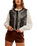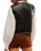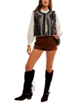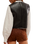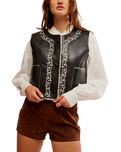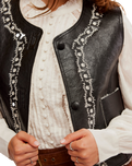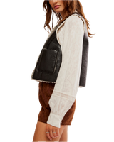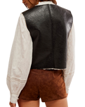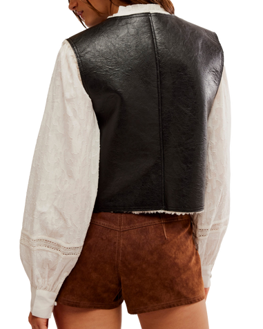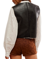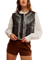 The Women's Travellers Leather Waistcoat in Black & Cream from Free People is a chic woven gilet designed for both style and comfort. Crafted from 100% viscose coated with polyurethane, it offers a sleek, leather-like appearance. The contrasting black and cream colour scheme adds a bold, sophisticated touch. This waistcoat features luxurious faux fur trim, enhancing its bohemian charm and providing extra warmth. Designed with a flattering, tailored fit, it includes practical front pockets and a button-down closure. Perfect for layering over your favourite tops and dresses, the Travellers Leather Waistcoat combines edgy elegance with versatile functionality for any occasion.