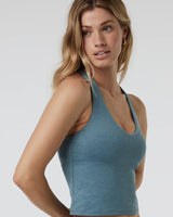 The Vuori Womens Halo Performance Crop Tank Top 2.0 in Smoke Blue Heather