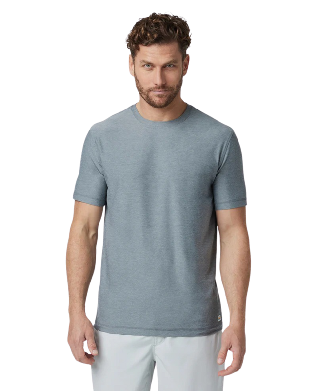 Introducing the Vuori Mens Strato Tech T-Shirt in Dusty Blue Heather, the ultimate muscle tee designed for those who demand performance and style.
