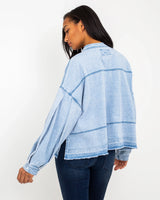 Crafted from super soft denim, this shirt offers a luxurious feel against your skin. The slouchy, boxy relaxed fit adds an effortlessly chic vibe, making it a versatile piece for any occasion. Exposed seaming and exaggerated dropped sleeves add unique details that set this shirt apart. The V-neckline adds a touch of femininity, while the raw bottom hem and puffed sleeves contribute to the overall laid-back yet fashion-forward look. Dropped shoulders complete the relaxed feel of this denim pullover.