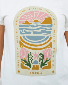 Introducing the Born By The Sea Cornwall Arch T-Shirt, a perfect blend of style and sustainability. This rolled short sleeve t-shirt is crafted from 100% GOTS certified organic cotton, ensuring both comfort and an eco-friendly choice. Crafted from a lightweight fabric, it's ideal for warm days by the coast.