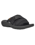 The Teva Hurricane Verge Sliders in Black feature quick-drying webbing crafted from recycled plastic using traceable, verifiable Repreve polyester yarn by Unifi, providing durable support that withstands heavy use.
